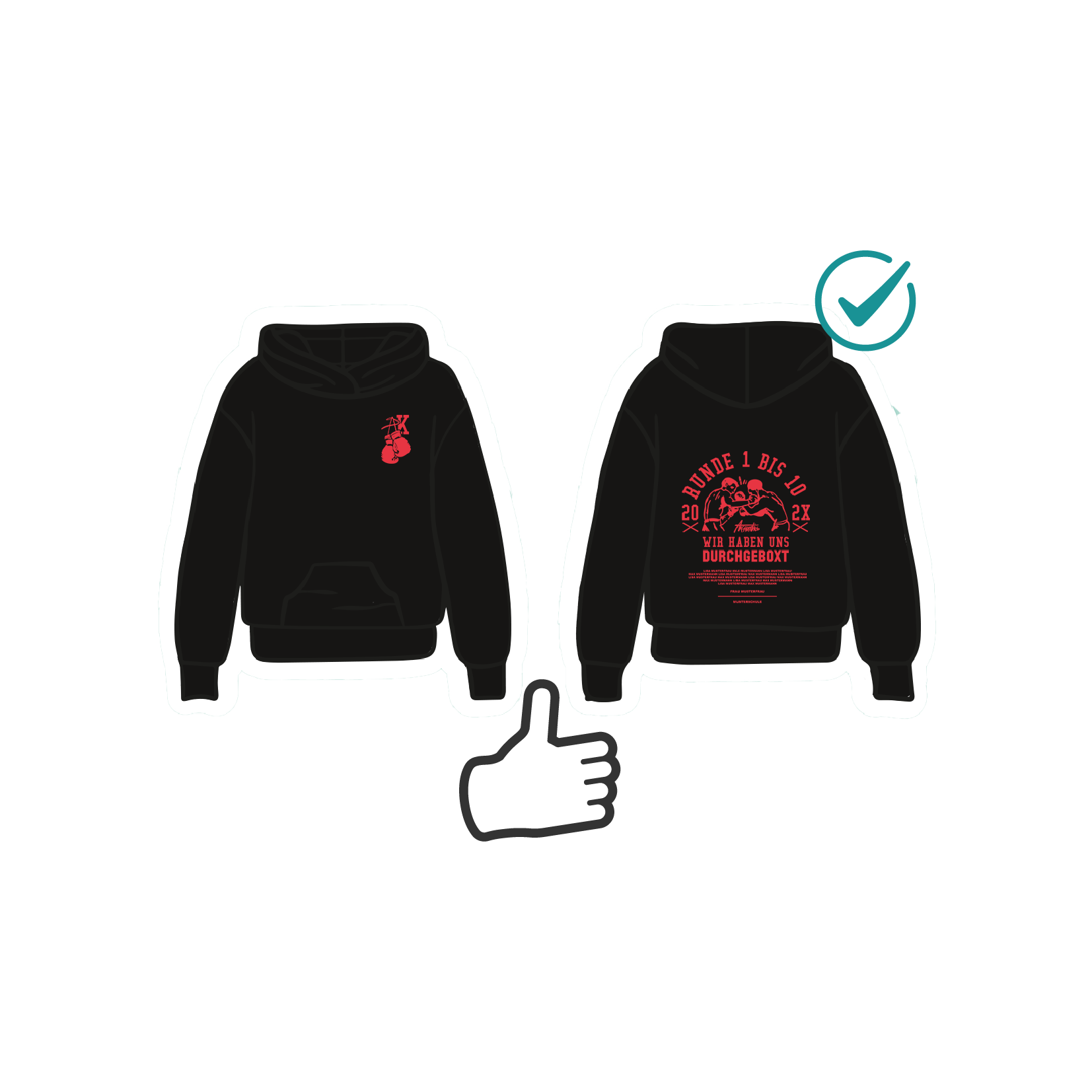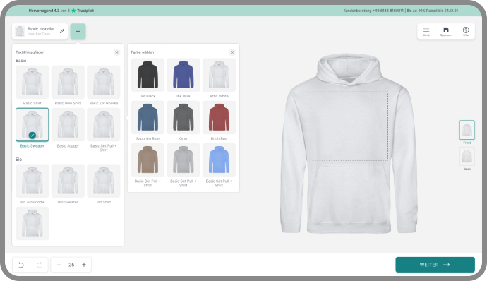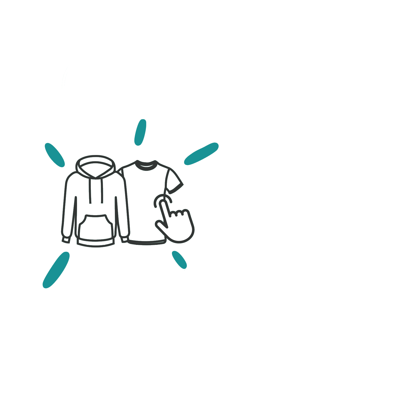 Wählt ein Produkt aus unserem Sortiment aus, oder stellt ein Set zusammen (z.B. Hoodie & T-Shirt), dann könnt ihr eure Textilfarben festlegen und ganz einfach eure Konfektionsgrößen eintragen.
